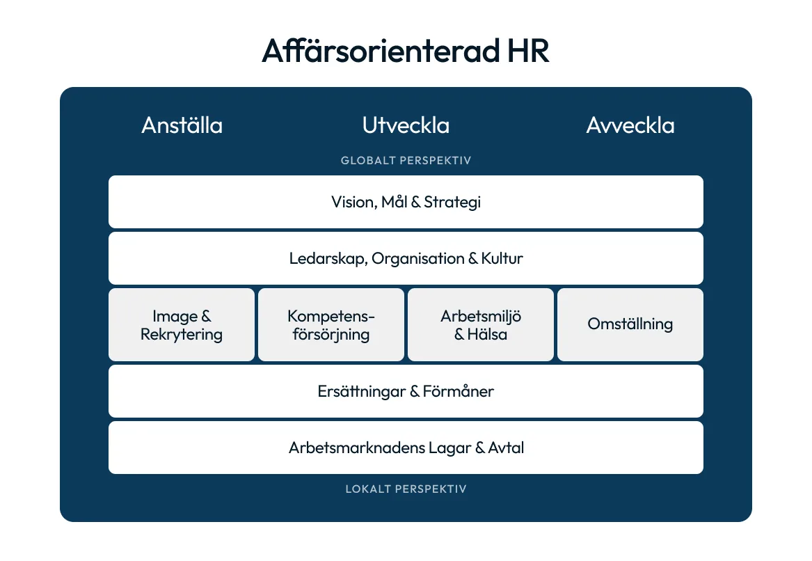 Arbetet med att Anställa, Utveckla och Avveckla medarbetare kan i sin tur delas in i två huvudsakliga perspektiv; det Globala och det Lokala perspektivet.